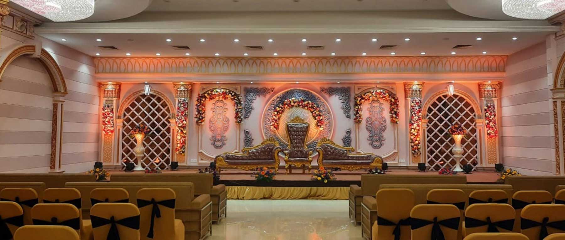 We offer an elegant & spacious venue with a total area of 10,000 sq, ft. This Convention Hall features in-built AC systems, Premium Crockery, Surveillance Systems and Parking Facility; Accented with elegant crystal chandeliers that illuminates lustrous silk wall coverings. Rhodium 7 Convention Hall has 2 floors which can be used individually or together. We can accommodate large numbers up to 1500+ guest. We can accommodate large numbers up to 1500+ guest. Though our services are affordable, we never compromise with the quality provided to clients.